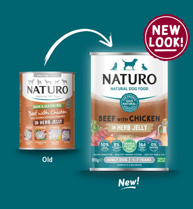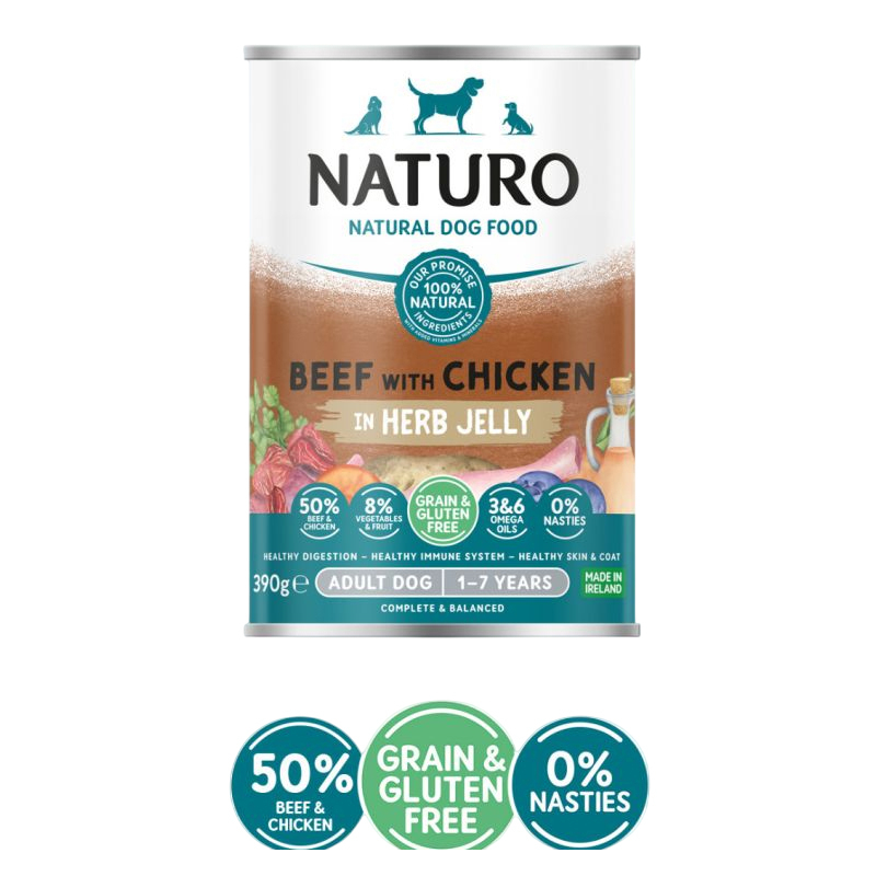 Hrana completă Naturo cu carne de vită și pui, în jeleu cu ierburi aromatice, oferă o combinație delicioasă și hrănitoare pentru câinele tău. Fără cereale, fără gluten, cu ingrediente naturale și aditivi esențiali pentru susținerea sănătății digestive, articulare și a unei blăni strălucitoare!