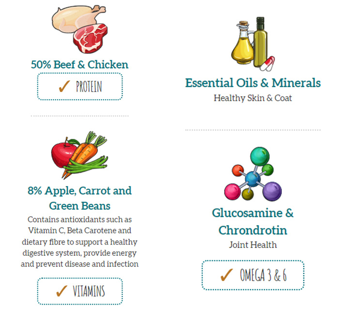 ✅ 50% carne de vită și pui de calitate superioară pentru un aport proteic optim