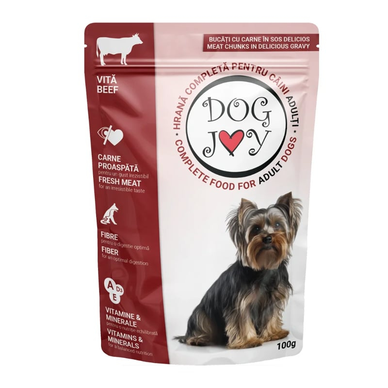 DOG JOY, Plic cu Vită în sos, 100g – hrană umedă completă și echilibrată, destinată câinilor adulți, ce oferă proteine de calitate, vitamine și minerale, pentru o dietă gustoasă și sănătoasă.