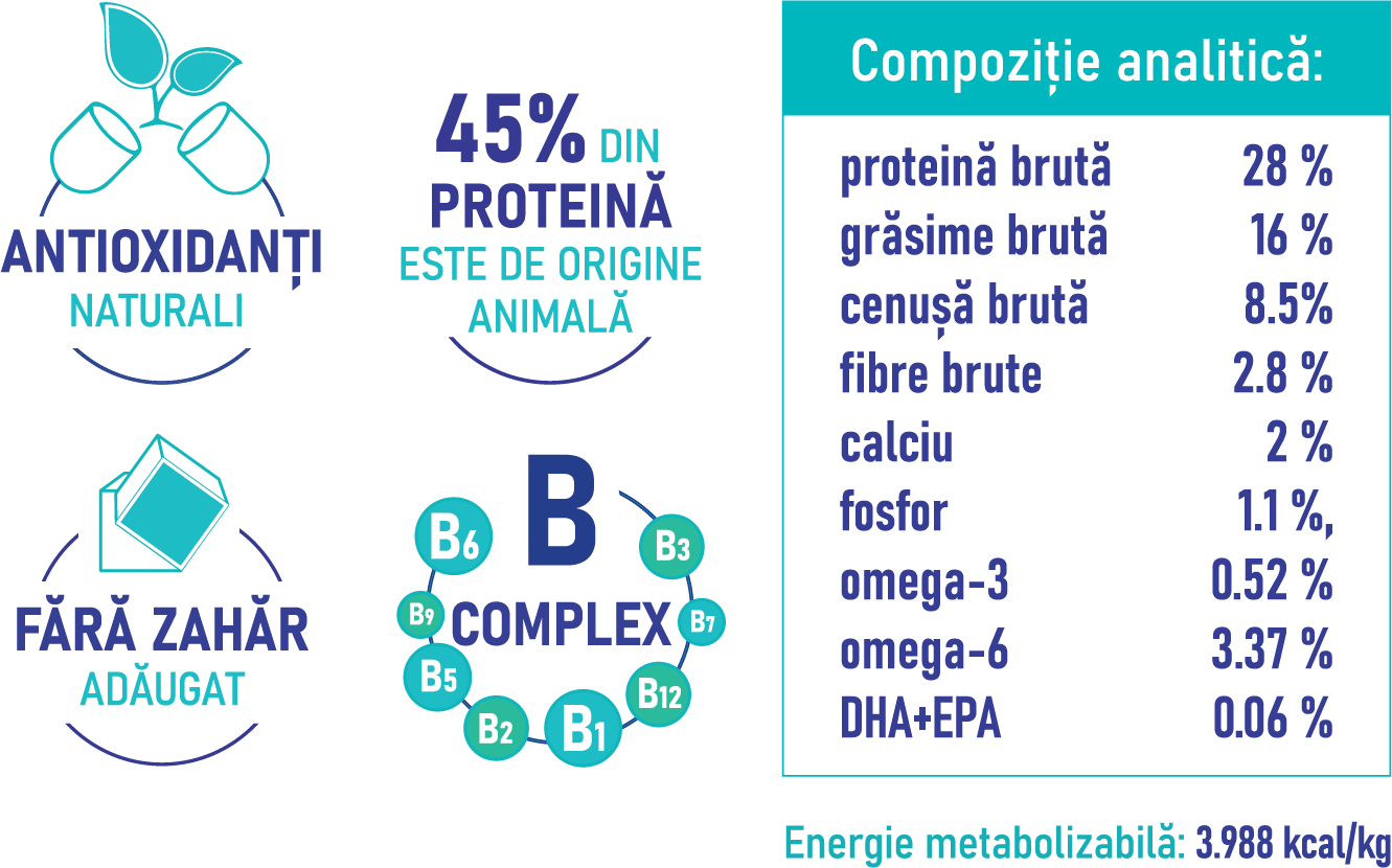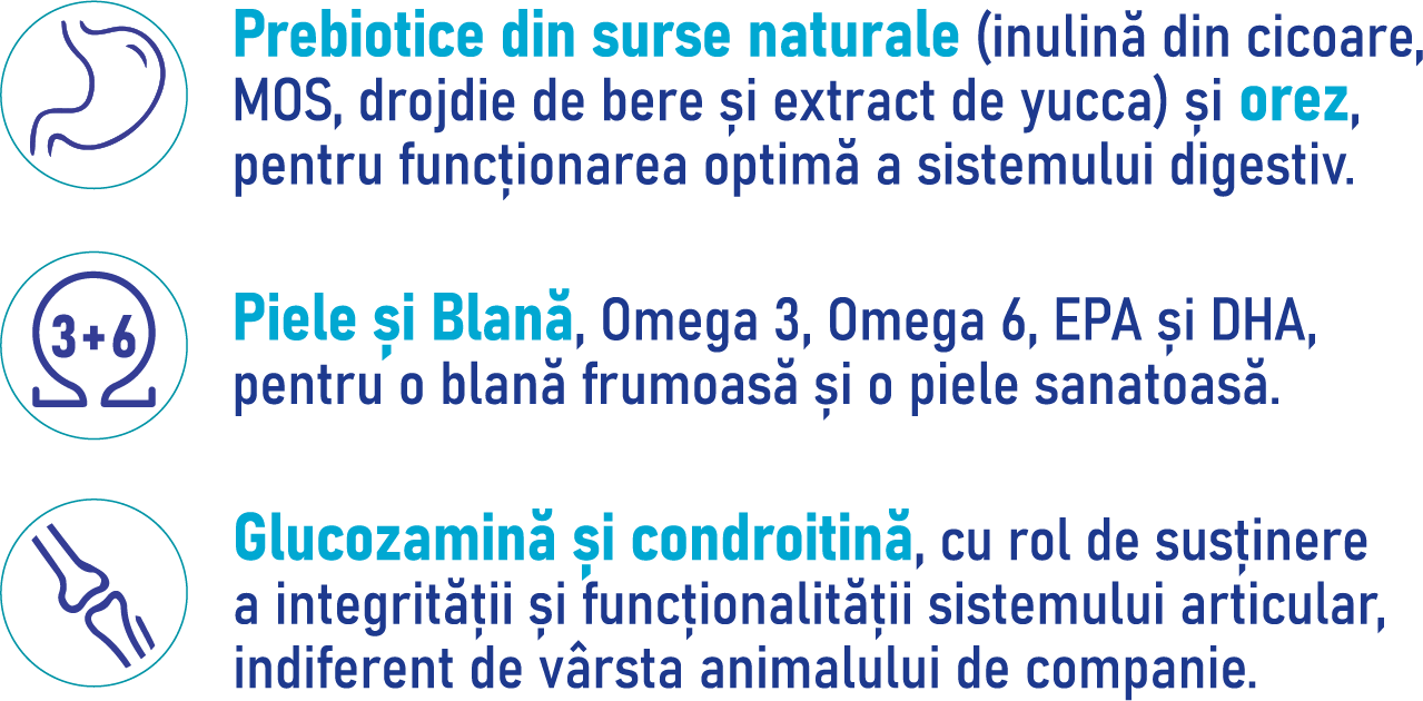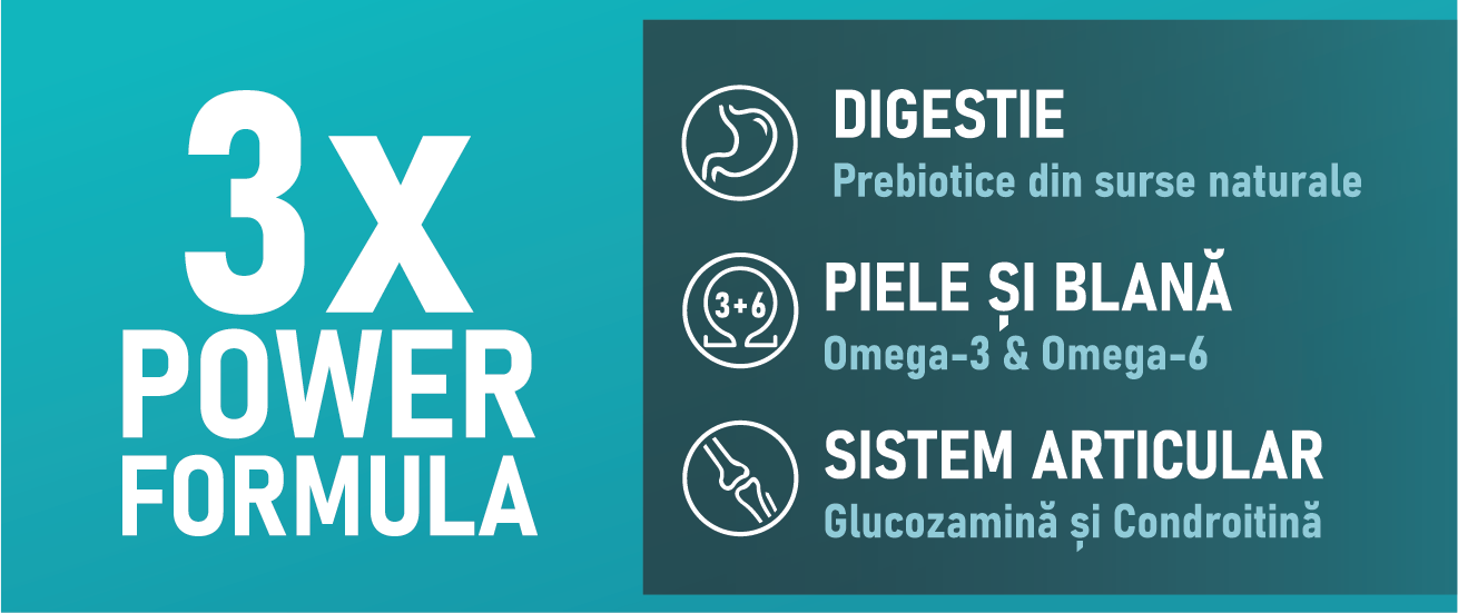 În plus, combinația de glucozamină și sulfat de condroitină oferă suport articulațiilor, fiind ideală pentru câinii activi sau de talie mare.