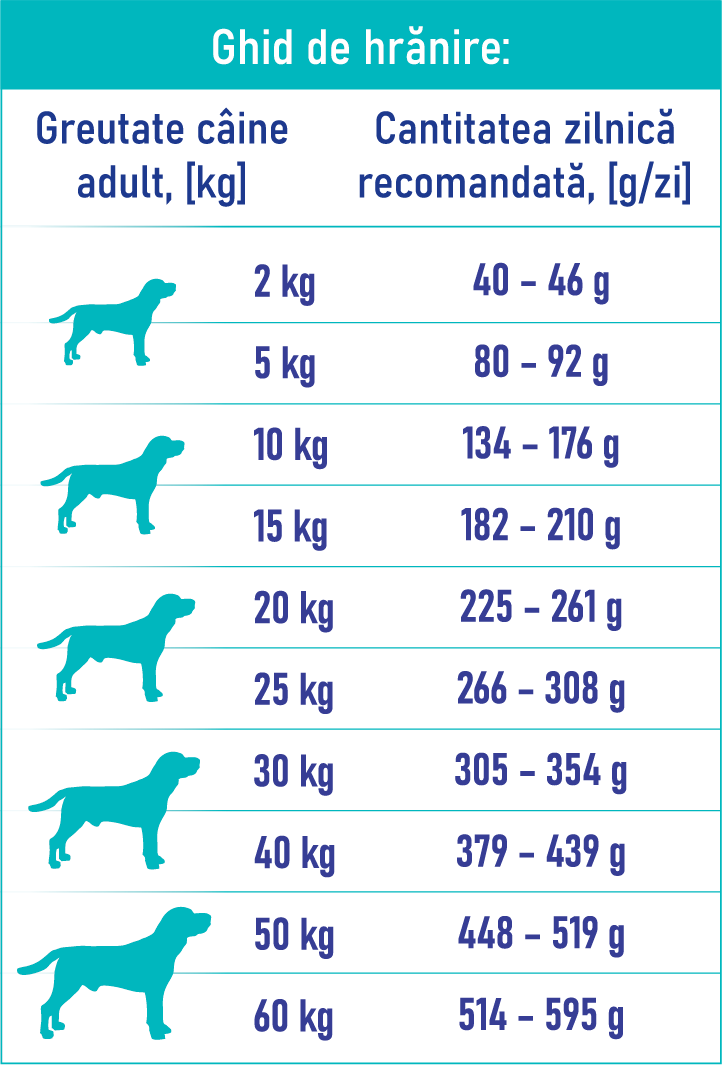 Rația zilnică recomandată variază în funcție de greutatea, vârsta, nivelul de activitate și starea fiziologică a câinelui. Asigură întotdeauna accesul la apă proaspătă. Consultă tabelul de pe ambalaj pentru cantitățile exacte.