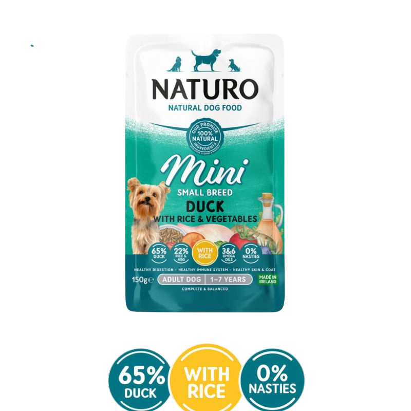 Naturo Pouch Adult Mini cu Rată și Orez este o hrană umedă completă și naturală pentru câini de talie mică. Conținând 60% carne de rață, legume și orez brun, această rețetă echilibrată susține sănătatea câinelui tău, oferind un aport optim de nutrienți și energie.
