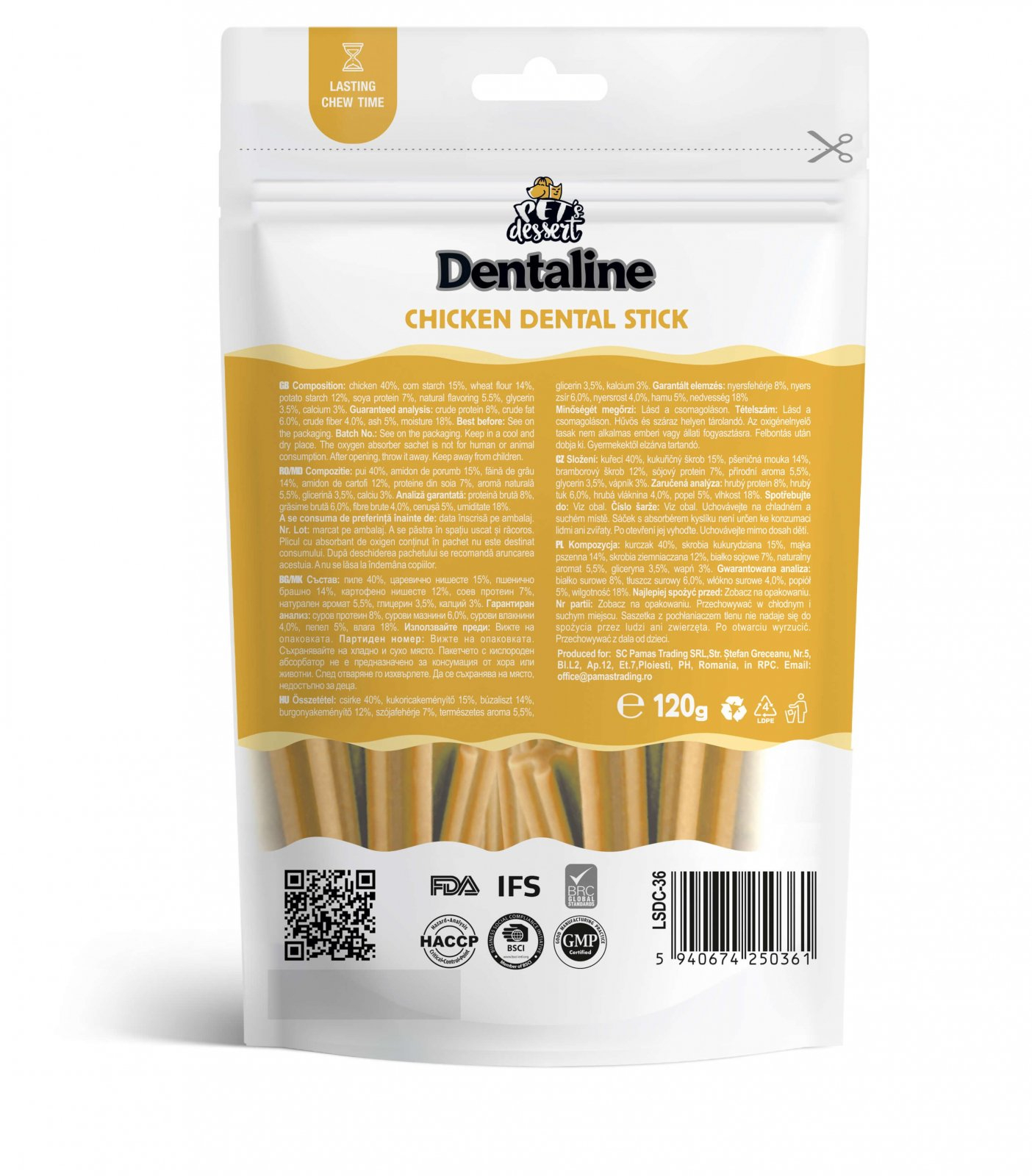 Pet’s Dessert Dentaline Sticks cu Pui sunt gustări funcționale create pentru a transforma rutina dentară într-un moment plăcut. Cu 40% carne de pui și o textură concepută pentru o mestecare îndelungată, aceste sticks-uri ajută la curățarea mecanică a dinților, reducerea tartrului și menținerea unei respirații proaspete – în timp ce oferă câinelui tău un gust delicios și natural.