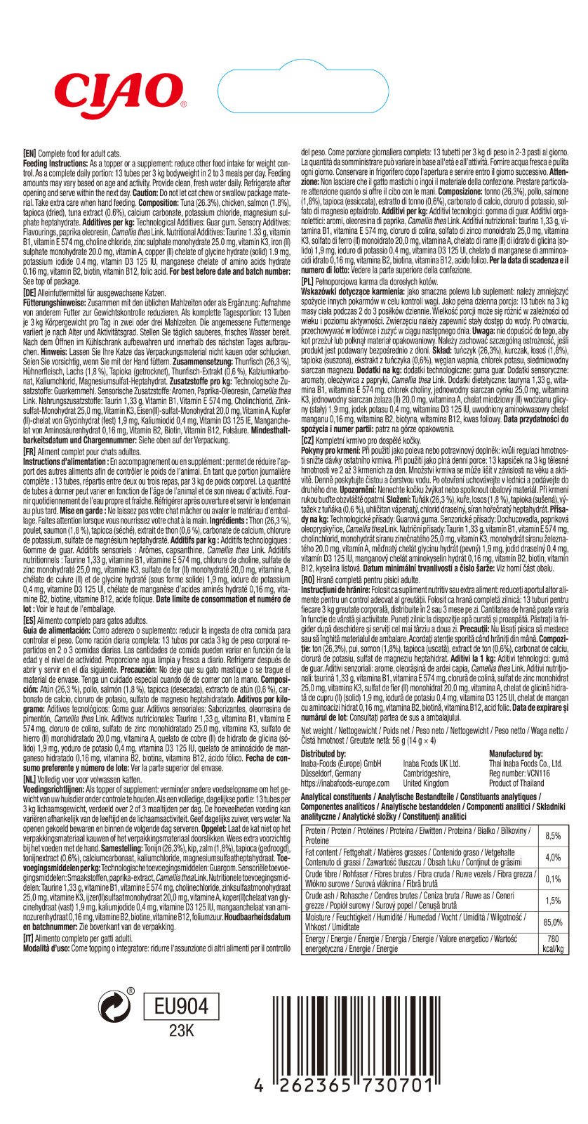 • Ca masă completă: Se administrează aproximativ 21 de tuburi pe zi, împărțite în 2-3 mese, pentru o pisică de 3 kg.