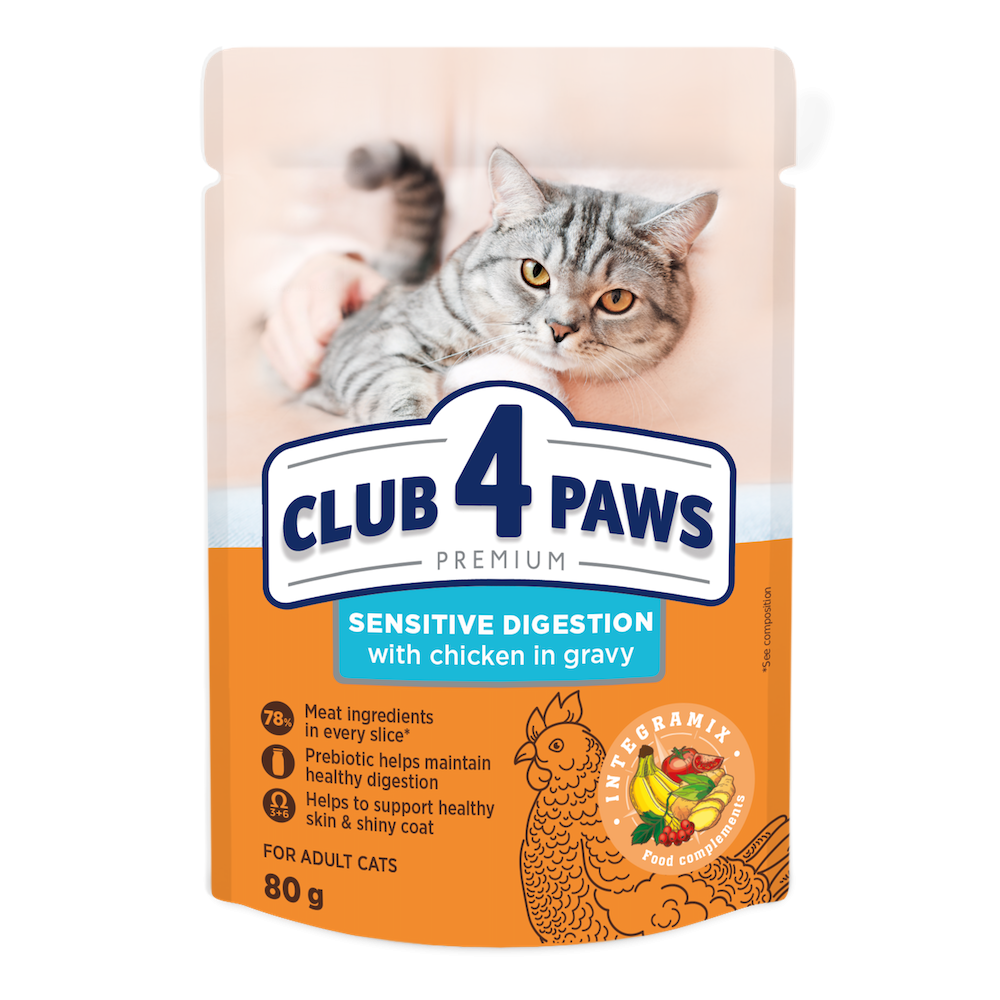 Hrana umedă CLUB4PAWS Premium Sensitive Digestion cu pui în sos este perfectă pentru pisicile adulte cu digestie sensibilă. Conține prebiotice, carne de calitate și nutrienți esențiali pentru o sănătate optimă!