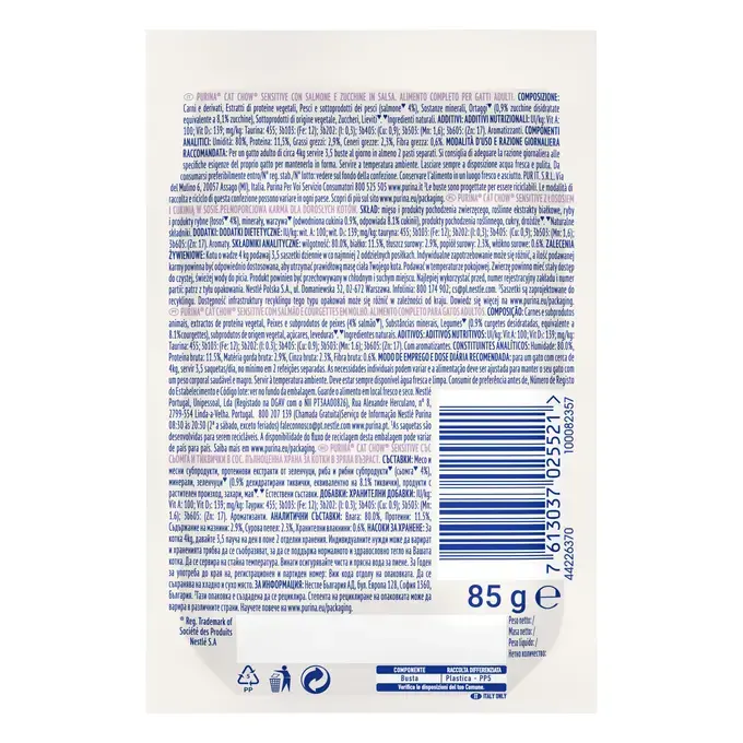 Purina Cat Chow Sensitive cu Somon și Dovlecei, 85g oferă pisicii tale o masă gustoasă și hrănitoare, susținând sănătatea pielii, a blănii și a sistemului digestiv.