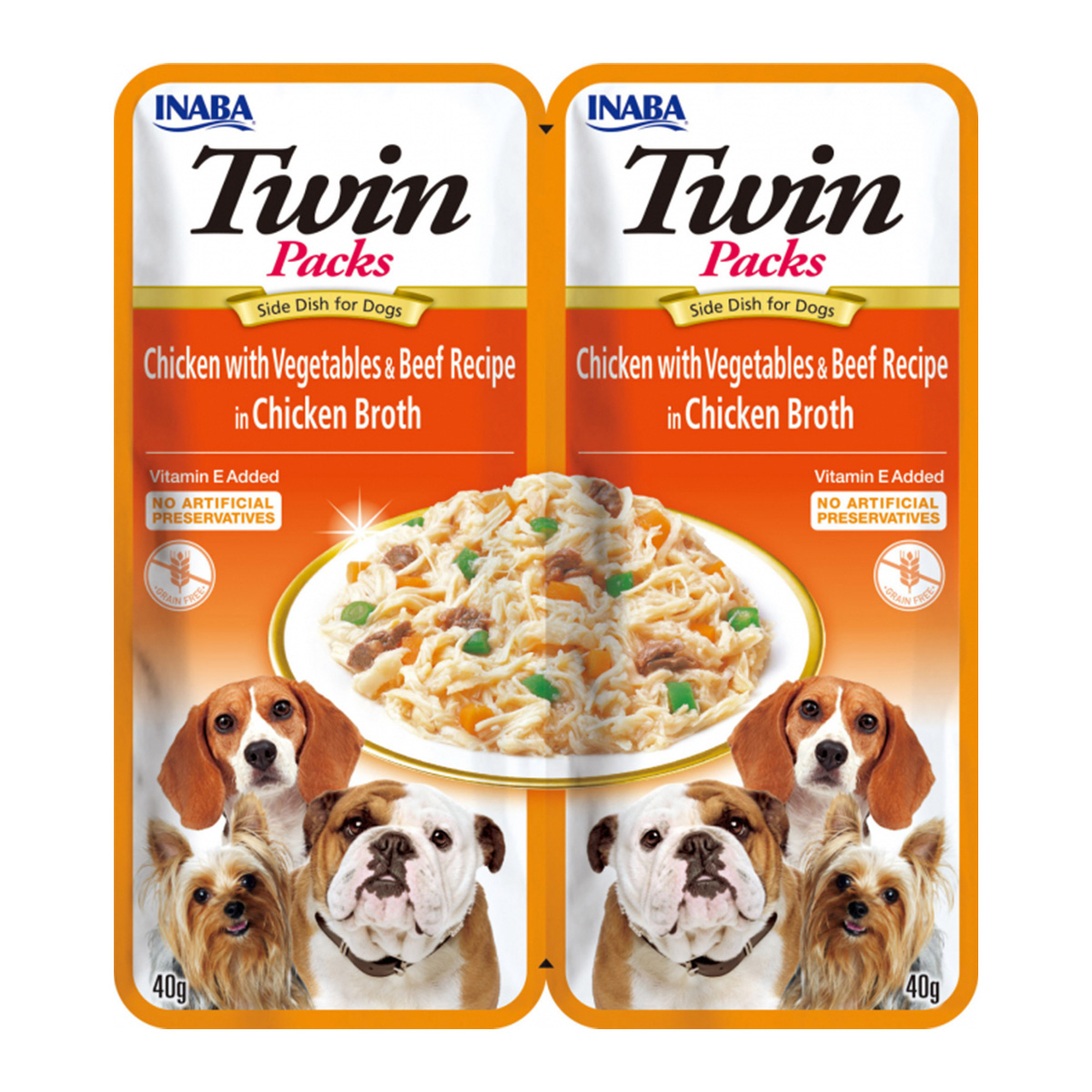 Inaba Churu Dog Twin Pui cu Legume și Vită în Supă de Pui combină pui crescut la fermă, carne de vită suculentă și legume proaspete într-o supă fină, extrem de apetisantă. Textura cremoasă și conținutul ridicat de umiditate (85%) îl vor face pe câinele tău să adore fiecare înghițitură, iar tu vei avea siguranța că îi oferi o gustare sănătoasă și nutritivă.