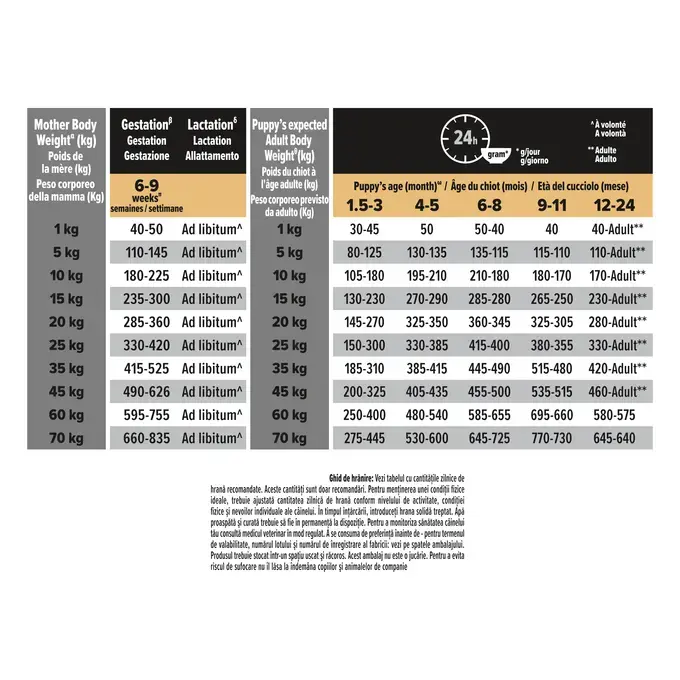 Hrana se administrează începând cu înțărcarea (aprox. 6–8 săptămâni), conform recomandărilor medicului veterinar.