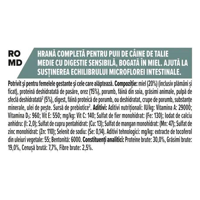 Purina PRO PLAN Medium Puppy Sensitive Digestion cu Miel este o hrană completă și echilibrată, destinată puilor de câine de talie medie (10–25 kg la maturitate) care au un sistem digestiv sensibil. Formula este dezvoltată de experți Purina, cu prebiotice testate științific și miel ca sursă principală de proteine, pentru o nutriție adaptată nevoilor de creștere.