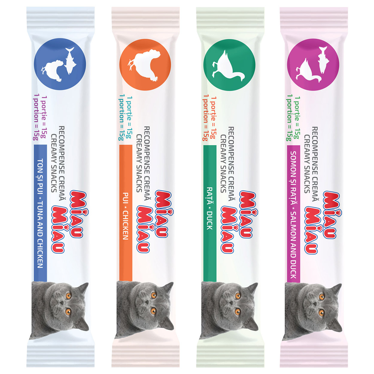 MIAU MIAU Creamy Snacks sunt gustări premium, concepute pentru a oferi pisicii tale o experiență gustativă de neuitat. Fiecare variantă conține proteine de calitate superioară din somon, rață, ton și pui, și este îmbogățită cu taurină, un aminoacid esențial pentru sănătatea inimii și a vederii pisicii tale.