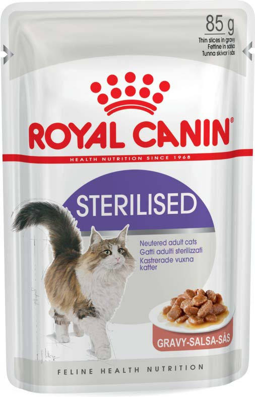 Royal Canin Sterilised, Hrana umedă pentru pisici, Plic în Sos, 85g este o hrană completă, echilibrată, creată pentru pisicile adulte sterilizate. Ajută la menținerea unei greutăți optime și la susținerea sănătății aparatului urinar.