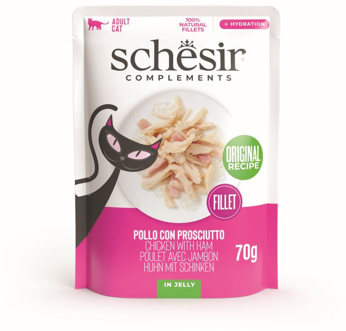Schesir aduce o rețetă premium cu fileuri de pui atent selecționate, combinate cu șuncă delicioasă și servite într-un jeleu fin și ușor digerabil. Este o hrană complementară care completează dieta zilnică a pisicii cu proteine valoroase, taurină și hidratare suplimentară.