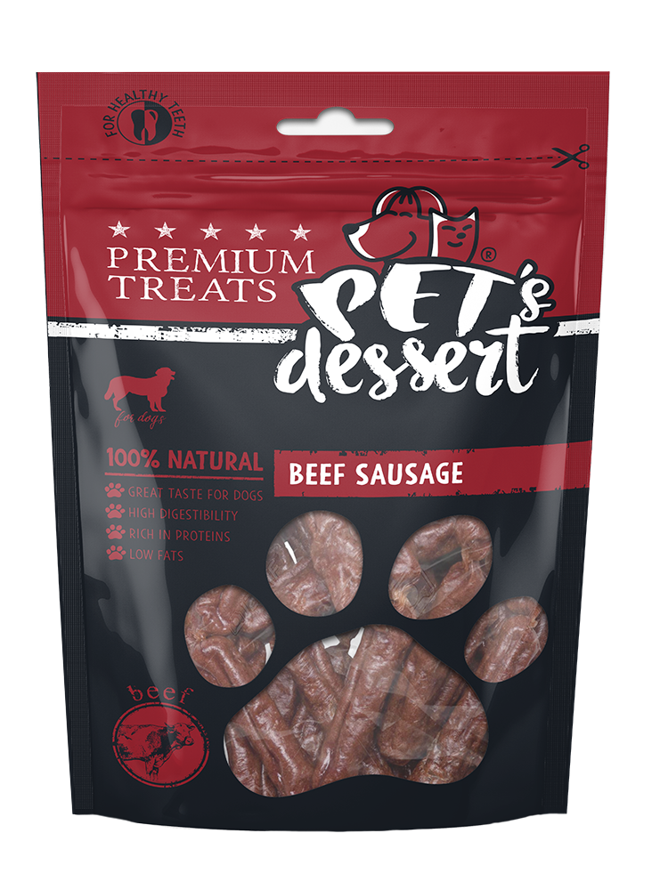 Transformă fiecare moment de gustare într-o experiență plăcută și sănătoasă pentru câinele tău cu Pet's Dessert Beef Sausage!