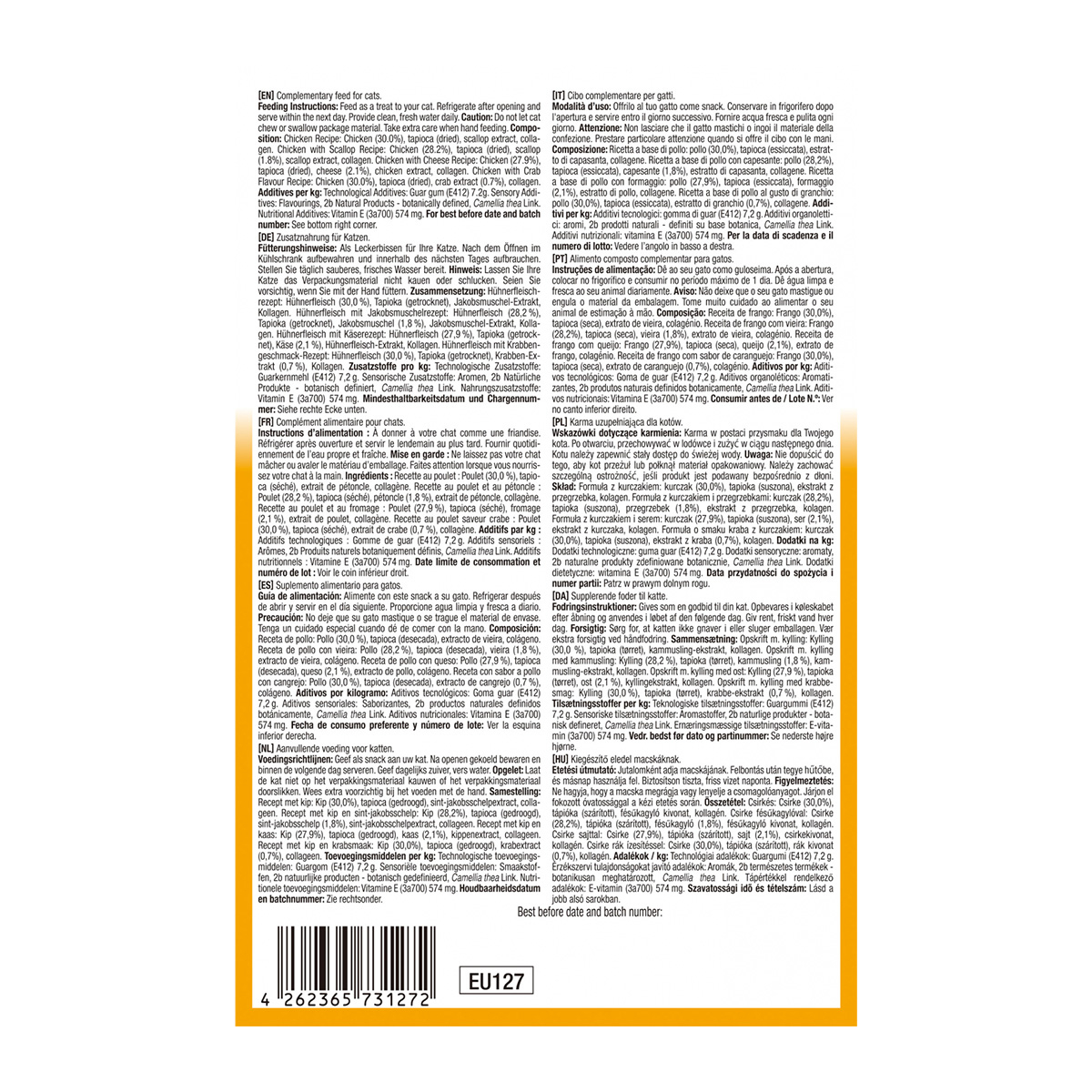 • Pui cu aromă de crab: Pui (30,0%), tapioca, extract de crab (0,7%), colagen