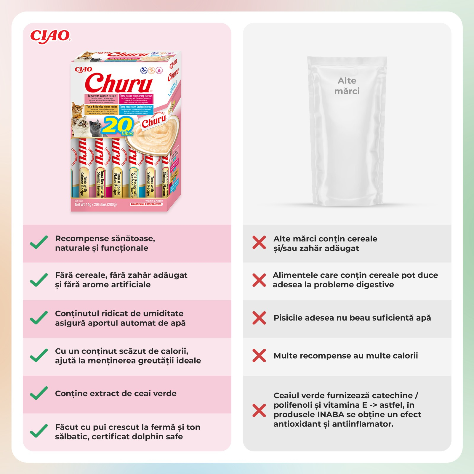 💡 Știai că? Pisicile sunt predispose la deshidratare, deoarece nu beau multă apă în mod natural. Gustările bogate în umiditate, precum Churu Inaba Ciao, contribuie la sănătatea rinichilor și previn problemele urinare!