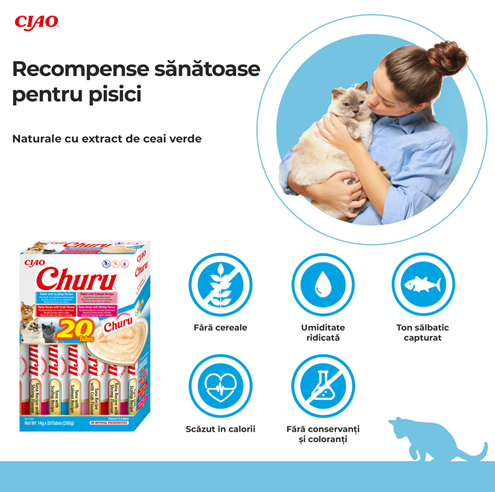 💡 Știai că? Pisicile pot avea dificultăți în a-și menține hidratarea optimă, deoarece nu beau multă apă în mod natural. Recompensele cu un conținut ridicat de umiditate, precum Churu Inaba Ciao, ajută la prevenirea problemelor urinare și la menținerea sănătății rinichilor!
